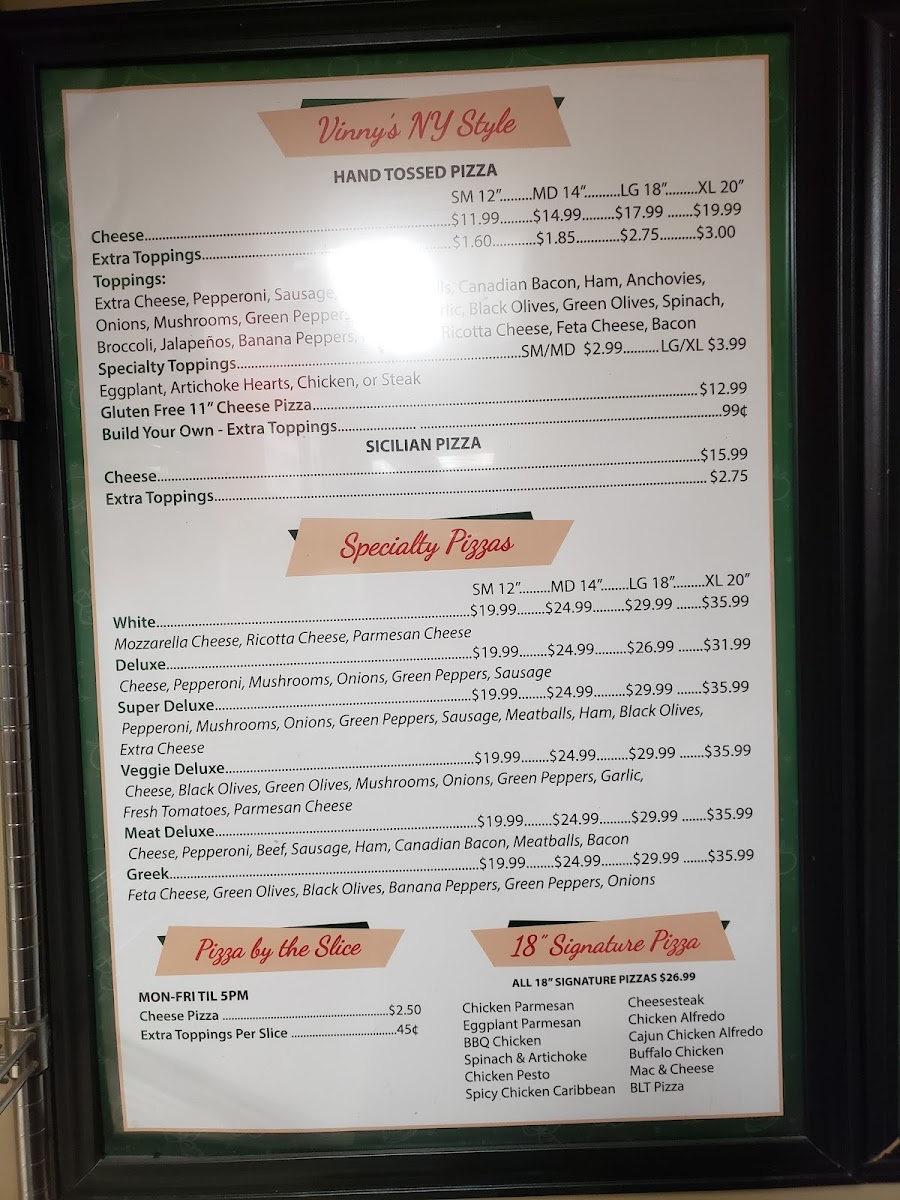 “ I’m from Chicago so I know pizza. While Vinny’s is more New York than Chicago, it is excellent pizza. We stay in St Augustine area about two months each year and we take out from Vinny’s several times. Highly recommend the cheese pizza and any of the salads. Don’t like the sausage pizza and the meatballs used to be larger and better. Stick to pizza and salad and you will be happy. ”
