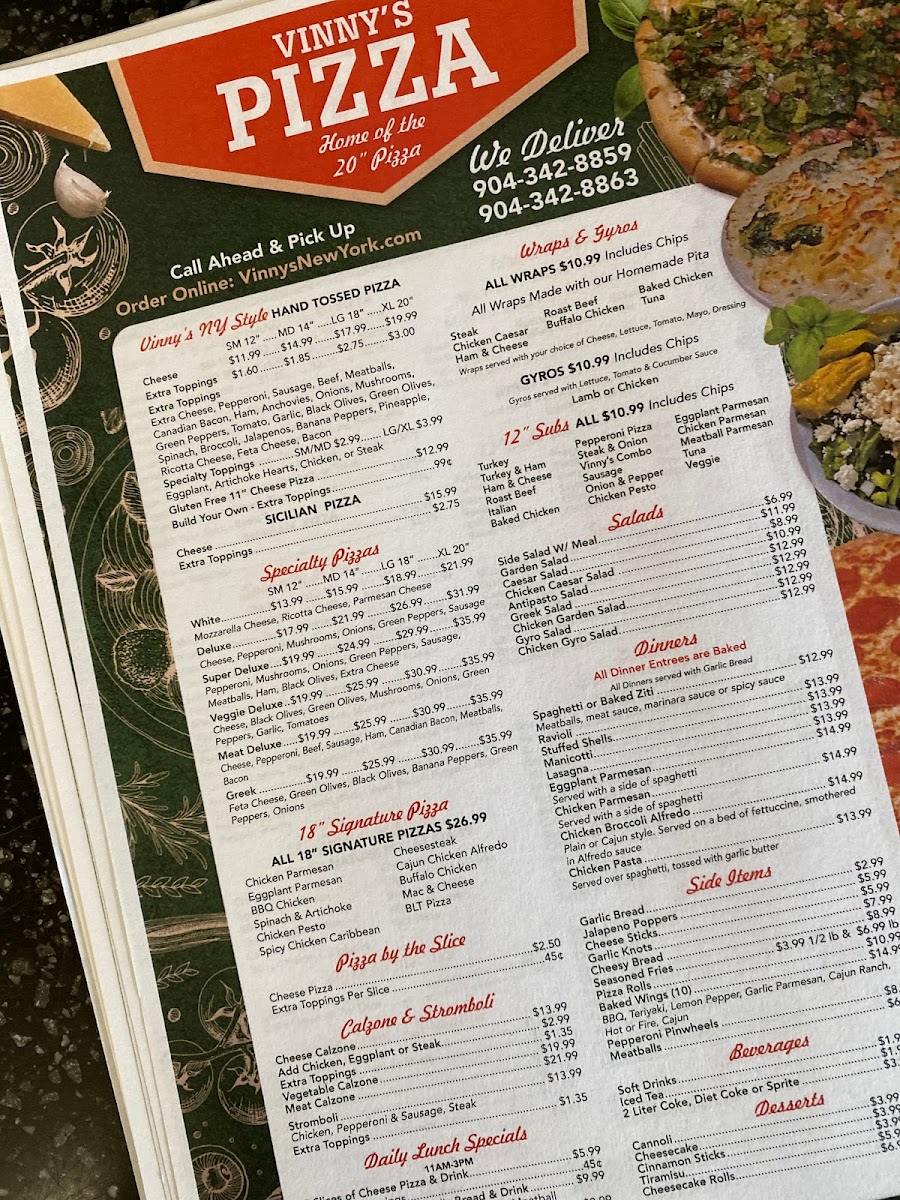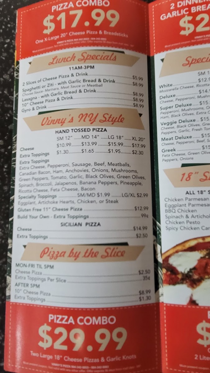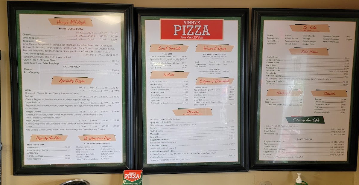 Welcome to Vinny's Pizza - St. Augustine, where authentic New York-style hand-tossed pizza awaits you at 105 Yacht Club Drive. Their menu features a delightful selection, including classic cheese pizzas starting at just $14.54 for a medium size and a range of signature pizzas like BBQ Chicken and Cheesesteak priced at $21.99.